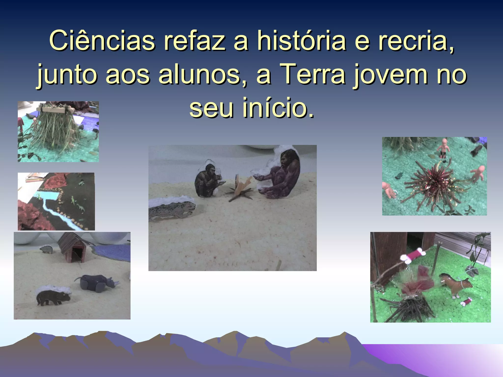 Os alunos do 6o ano representaram a Terra primitiva em Ciências, interpretando rochas, pessoas e animais antigos. Eles também exploraram como eram as primeiras hortas humanas e os métodos de plantio e colheita. O professor parabenizou Sheyla e os alunos pelo excelente trabalho.