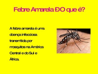 A febre amarela é uma doença viral transmitida por mosquitos que causa febre, mal-estar e hemorragias graves. Foi erradicada no Brasil em 1942 mas ainda existe em alguns estados. Seu vírus só se manifesta de 9 a 12 dias após a picada e a vacina é a melhor forma de prevenção, junto com repelentes e eliminação de locais de reprodução de mosquitos.