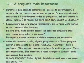 Este documento apresenta 5 lições de vida: 1) Conhecer o nome das pessoas com quem interagimos é importante; 2) Devemos ajudar os outros desinteressadamente; 3) Não julgar as pessoas precipitadamente; 4) Cada obstáculo representa uma oportunidade; 5) Devemos dar tudo por quem amamos.