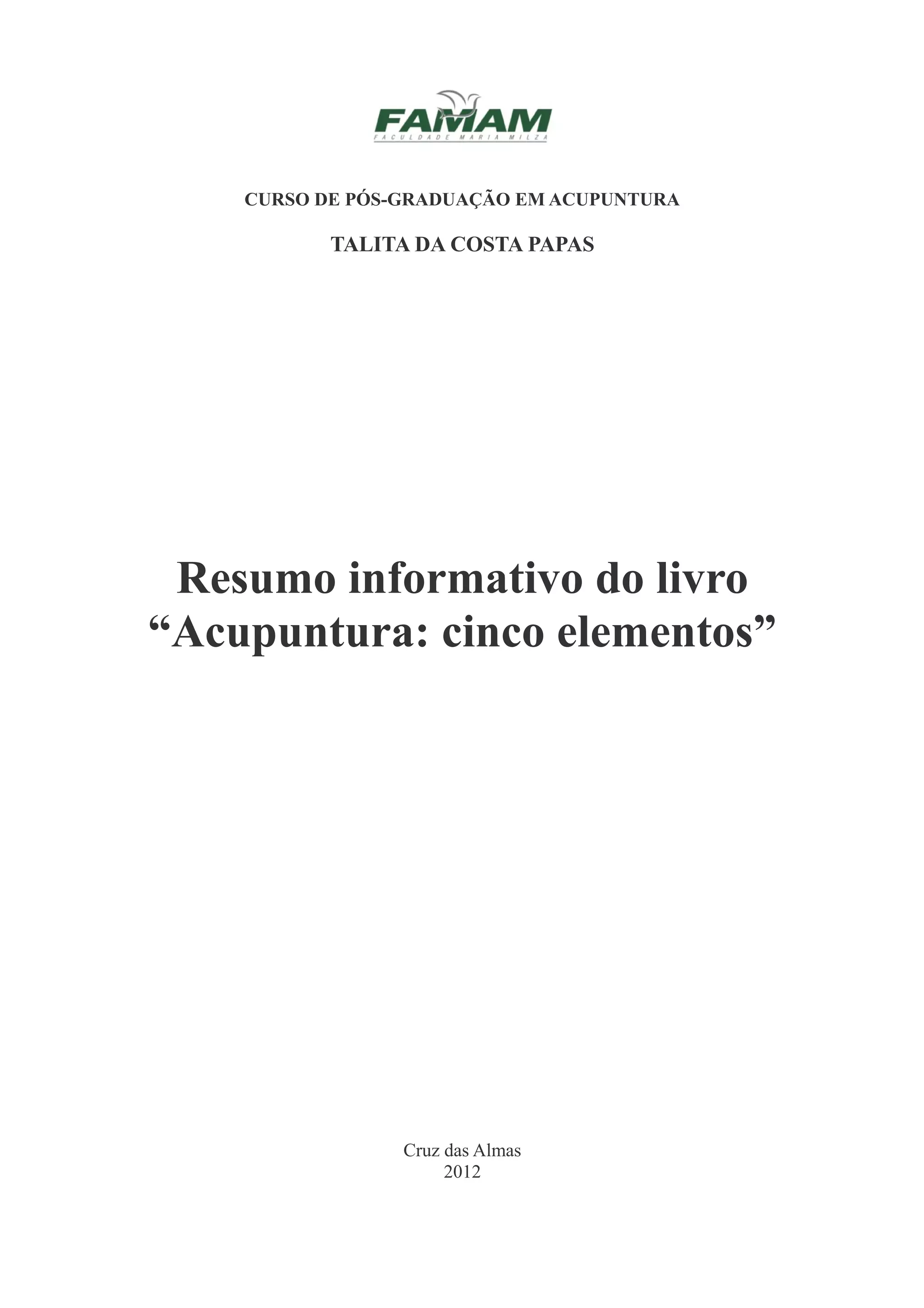 Este resumo descreve os principais pontos abordados no livro "Acupuntura: cinco elementos", incluindo uma introdução sobre os meridianos secundários (fogo, terra, metal, água), uma descrição dos meridianos LO, colaterais e tendineomusculares, e detalhes sobre alongamentos para os principais meridianos.