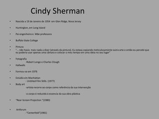 Cindy Sherman nasceu em 1954 nos EUA. Ela estudou pintura mas passou a se dedicar à fotografia, onde se tornou conhecida por suas séries de autorretratos que exploram temas como gênero e identidade. Suas obras fazem parte de coleções de importantes museus como o MoMA.