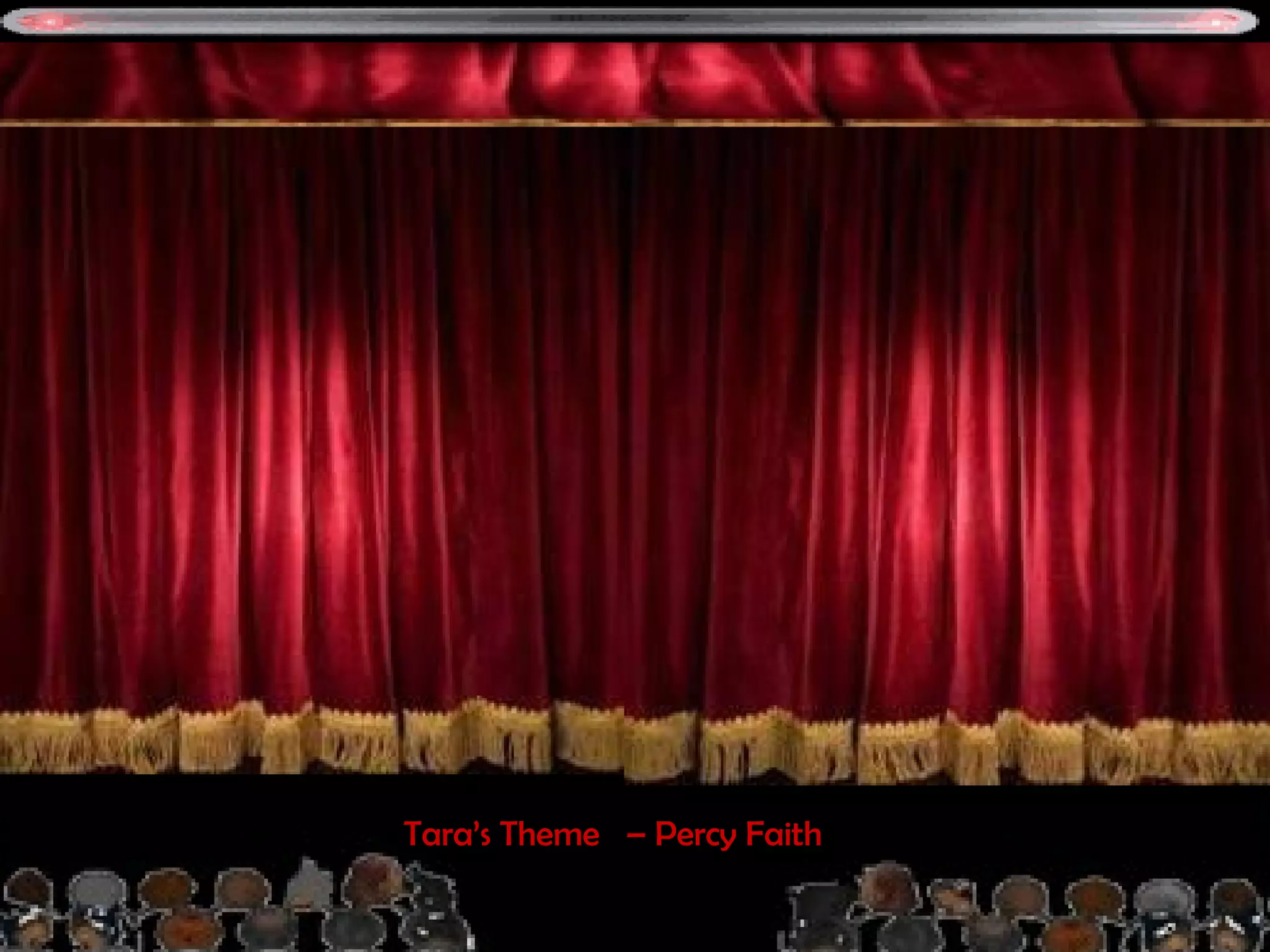 O documento fornece instruções sobre como navegar entre filmes em uma apresentação, incluindo como mudar de filme, obter informações sobre o elenco e sinopse, e alternar entre slides e informações. É fornecida uma lista de 14 filmes entre 1942 e 1965 com suas respectivas músicas temáticas e elencos.