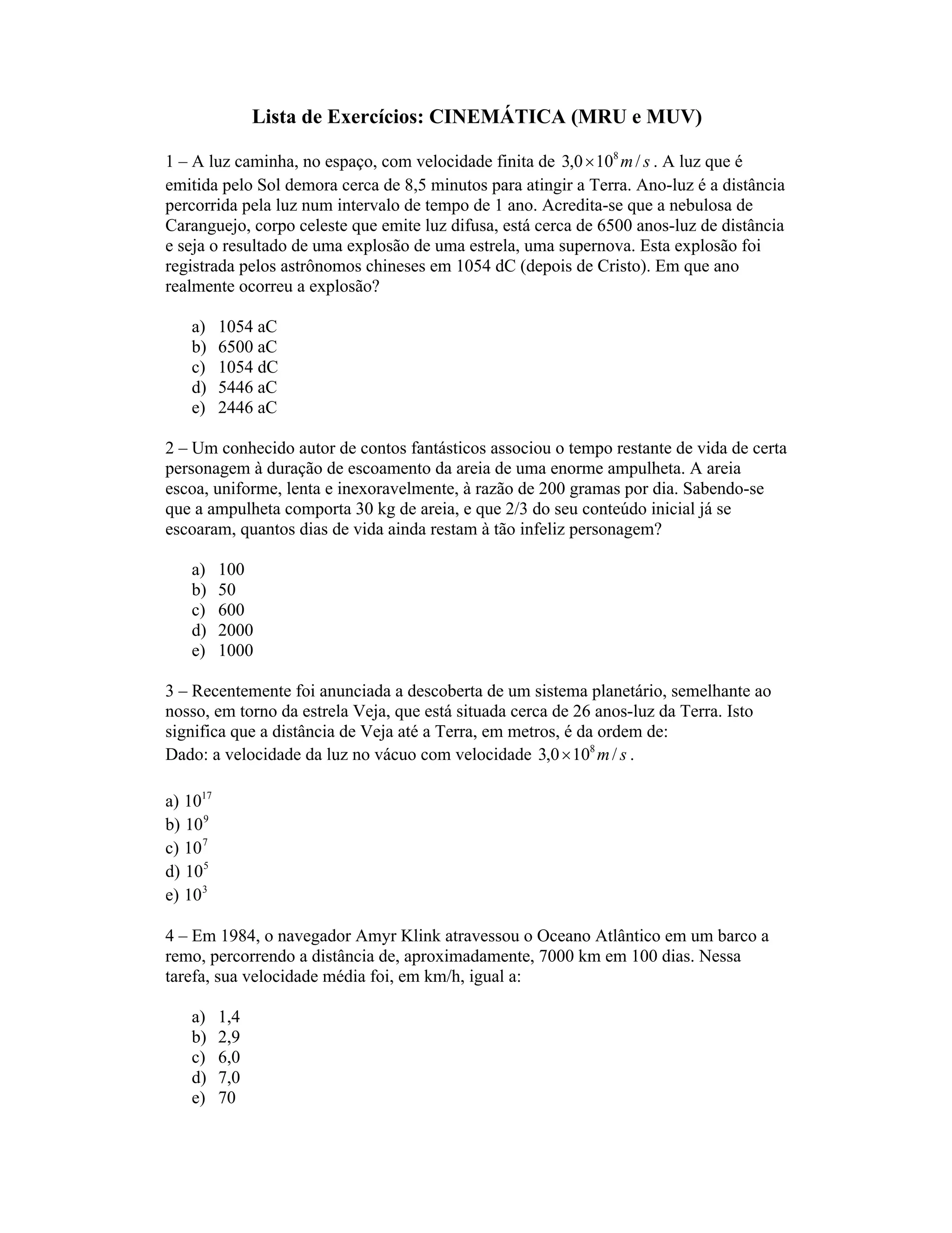 1. O documento apresenta uma lista de exercícios sobre cinemática de movimento retilíneo uniforme e movimento uniformemente variado, incluindo questões sobre velocidade média, aceleração, tempo e distância percorrida.