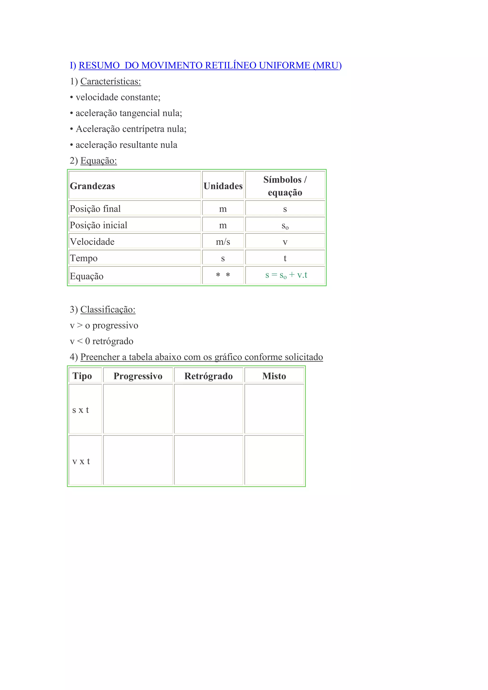 O documento apresenta o conceito de movimento retilíneo uniforme (MRU), caracterizado por velocidade constante e aceleração resultante nula. Apresenta também a equação que relaciona posição, tempo e velocidade para MRU. Por fim, traz exercícios sobre cálculos envolvendo posição, tempo, velocidade e distância percorrida para diferentes situações de MRU.