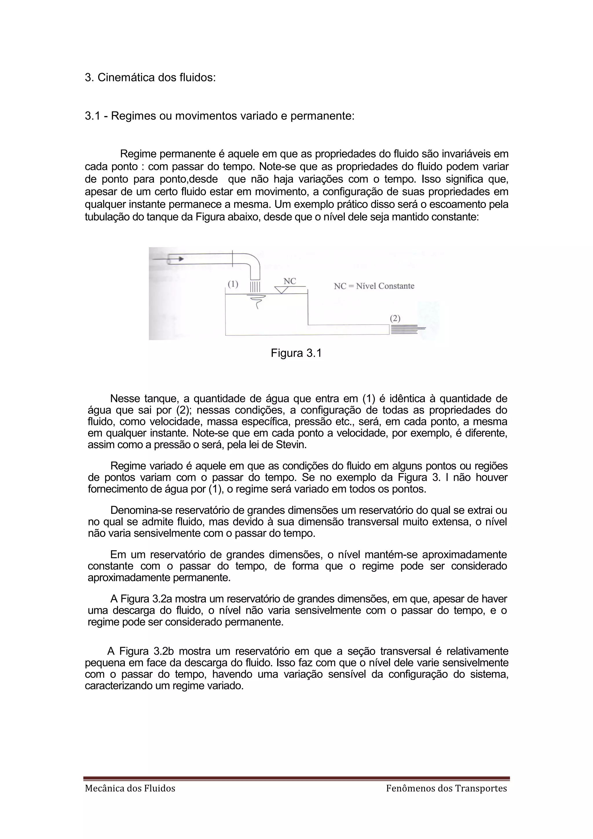 O documento descreve os conceitos de regime permanente e variado de escoamento de fluidos, escoamento laminar e turbulento. Explica que o regime é permanente quando as propriedades do fluido são invariáveis no tempo e variado quando variam no tempo. Descreve também que o escoamento é laminar quando as partículas se movimentam em camadas sem mistura e turbulento quando há movimentos aleatórios e mistura entre as partículas. Apresenta ainda exercícios sobre cálculo do número de Reynolds.