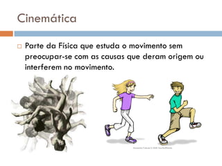 O documento apresenta conceitos básicos de cinemática, incluindo: (1) definição de cinemática como o estudo do movimento sem considerar suas causas, (2) definição de ponto material e corpo extenso, (3) definição de movimento e repouso em relação a um referencial, e (4) introdução de grandezas como deslocamento, distância percorrida e velocidade média.