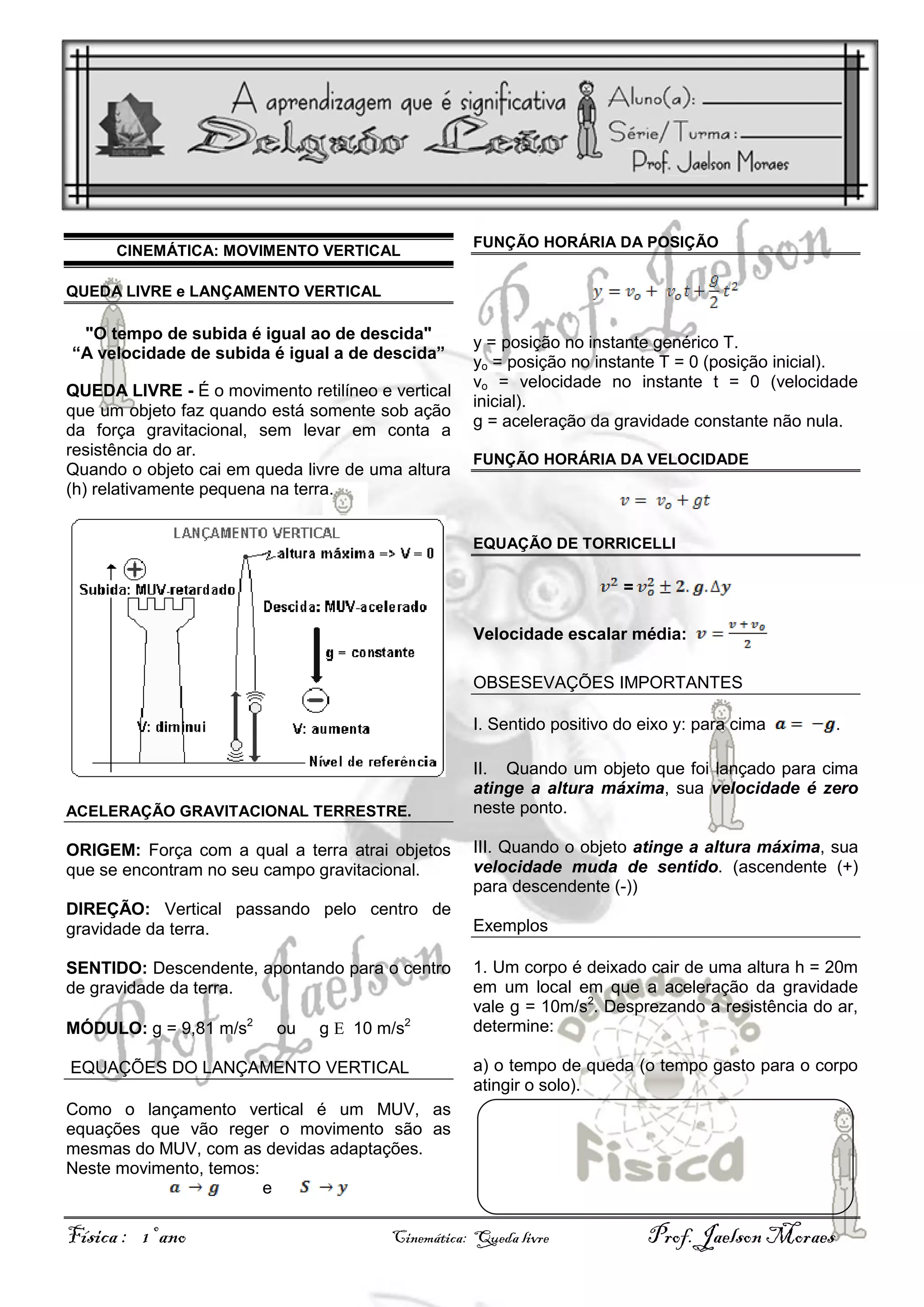 O documento discute o movimento vertical em queda livre e lançamento vertical, definindo equações para posição, velocidade e aceleração em função do tempo, considerando a aceleração da gravidade g. Apresenta exemplos de problemas envolvendo o cálculo de tempo, velocidade e altura nesses movimentos.
