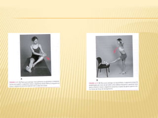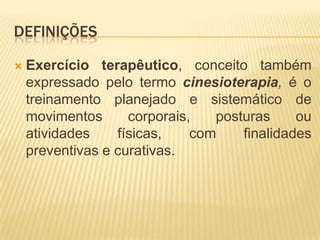 O documento discute cinesioterapia, definindo-a como exercício terapêutico planejado para fins preventivos e curativos. Apresenta os aspectos da função física, tipos de intervenções com exercício terapêutico e limitações funcionais comuns relacionadas a tarefas físicas. Também aborda amplitude de movimento, alongamento, mobilidade e flexibilidade.