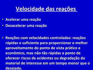 O documento discute a cinética química, incluindo a velocidade de reações, fatores que influenciam a velocidade e como calcular a velocidade média de uma reação. Explica que a velocidade depende da frequência e energia das colisões entre moléculas e pode ser afetada por fatores como temperatura, concentração dos reagentes e catalisadores. A velocidade média é calculada pela variação da concentração de um reagente ou produto dividido pelo tempo.