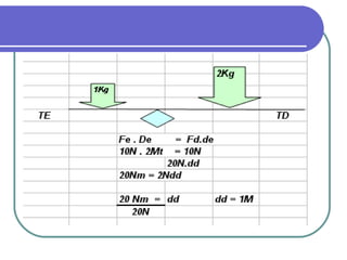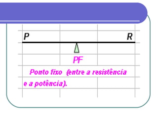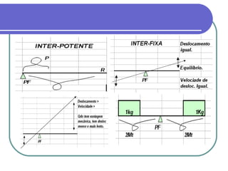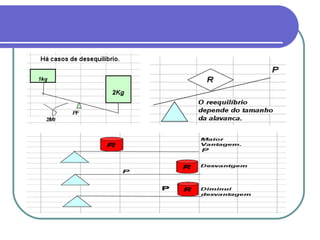 O documento discute os conceitos de alavanca e centro de gravidade no corpo humano. Apresenta os três tipos de alavancas - interfixa, inter-resistente e interpotente - e explica que a interpotente é a mais característica no corpo. Também define centro de gravidade como o ponto onde as forças gravitacionais sobre um corpo se equilibram, e lista fatores que afetam a estabilidade como tamanho da base de sustentação e distância do centro de gravidade em relação à borda da base.