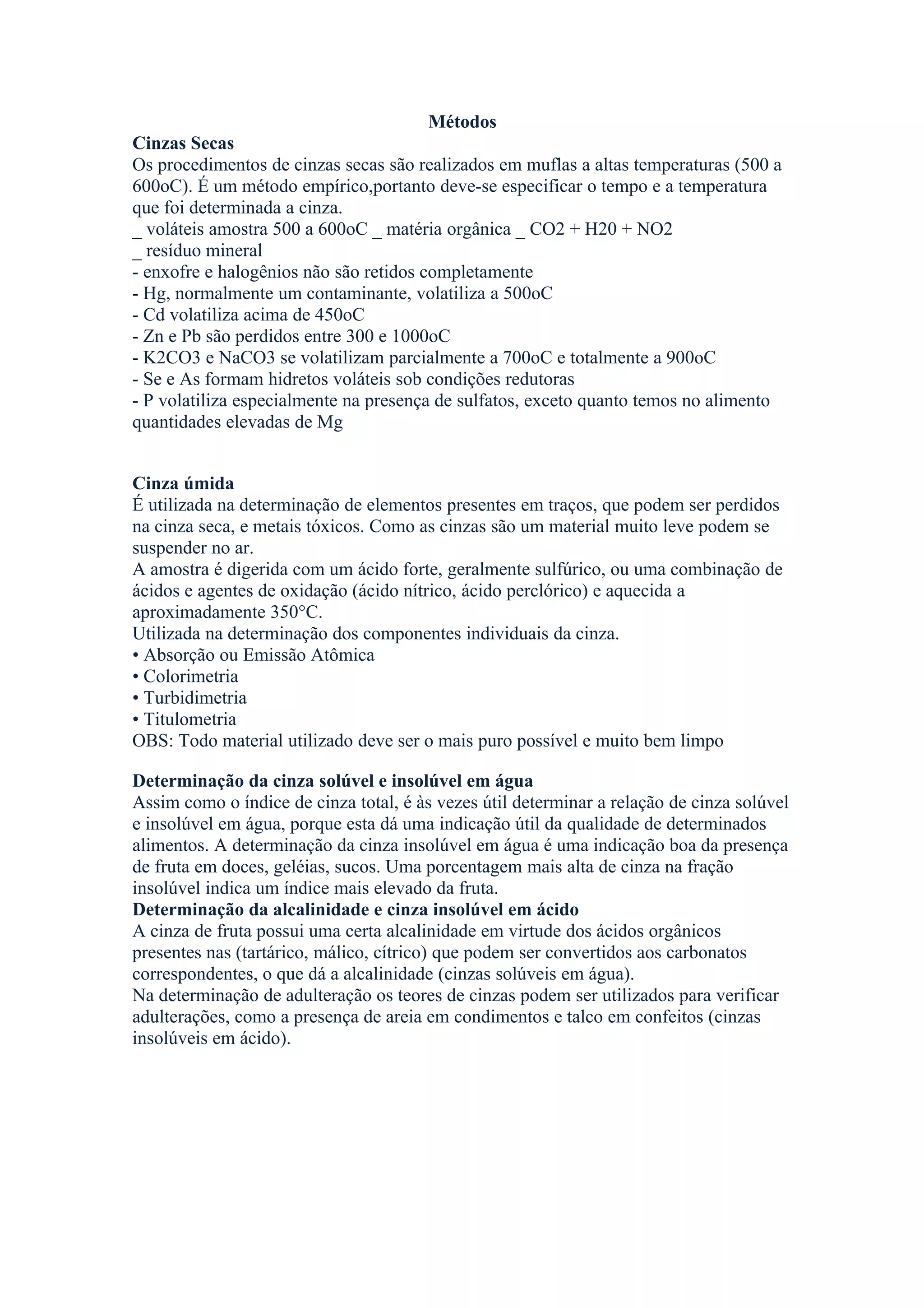 O documento descreve métodos para determinação de cinza em amostras, comparando cinza seca e cinza úmida. A cinza seca é mais usada para obtenção da cinza total e insolúvel, enquanto a cinza úmida determina metais em traços e é mais indicada para análise de metais tóxicos. Também discute fontes de erro na determinação de cinza e considerações sobre quantidade de amostra e preparo.
