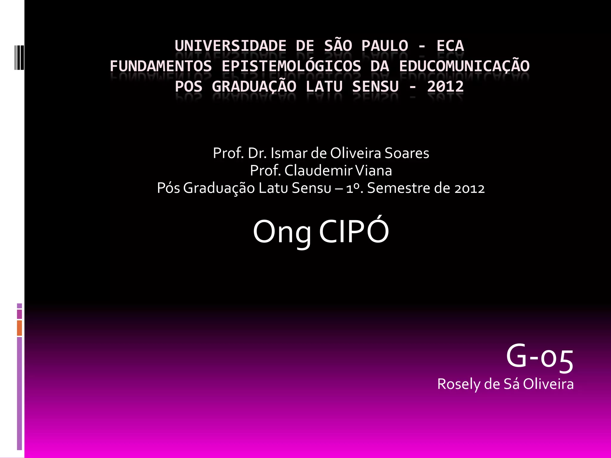 O documento descreve a ONG Cipó, que usa a educação pela comunicação para capacitar crianças, adolescentes e jovens. A Cipó já sistematizou projetos como escolas interativas, participação política juvenil e mídia para garantia de direitos. No entanto, enfrenta desafios como falta de estrutura escolar e descontinuidade de projetos. A Cipó conclui que a educação pela comunicação deve ser política pública para melhorar os índices educacionais e dar novo sentido de vida aos jovens.