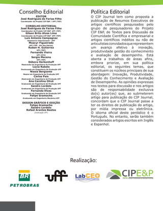 O documento apresenta as diretrizes editoriais do CIP Journal, periódico do Projeto CIP E&P da UFF. O jornal tem como objetivo publicar resumos de artigos científicos e textos para discussão sobre inovação, produtividade, gestão do conhecimento e avaliação de desempenho. O idioma principal é o português, mas também serão considerados artigos em inglês e espanhol. A publicação visa difundir os conhecimentos gerados pelo projeto CIP E&P.