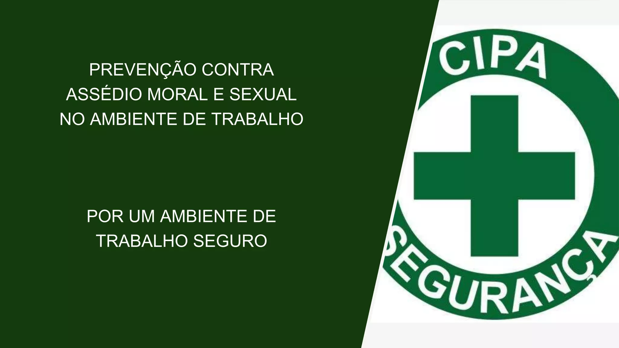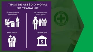 O documento discute prevenção contra assédio moral e sexual no ambiente de trabalho. Apresenta definições de assédio moral e sexual, causas, consequências e medidas de prevenção. Enfatiza a importância da informação e da conscientização sobre o tema para reduzir esses tipos de violência.