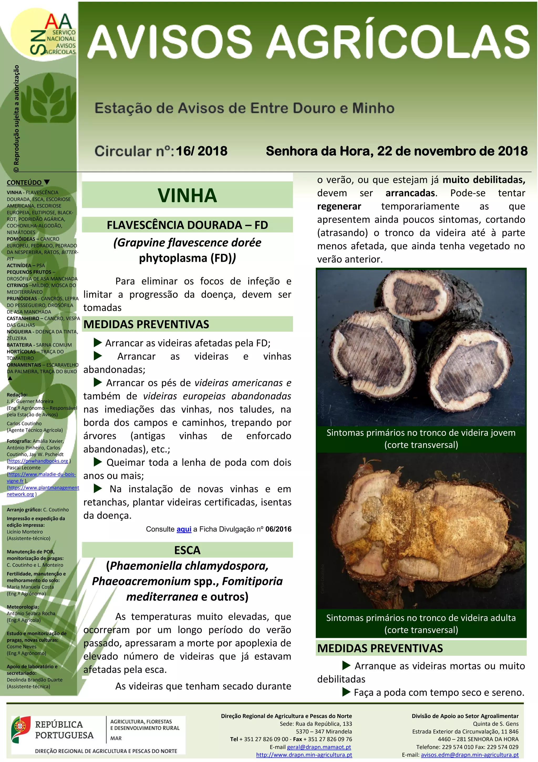 O documento fornece informações e medidas preventivas para várias doenças que afetam videiras na Região dos Vinhos Verdes em Portugal, incluindo a Flavescência Dourada, Esca, Escoriose Americana, Podridão Negra e outras. Recomenda arrancar videiras infectadas, queimar lenha de poda, usar apenas mudas certificadas livres de doença e desinfectar ferramentas para limitar a propagação das doenças.
