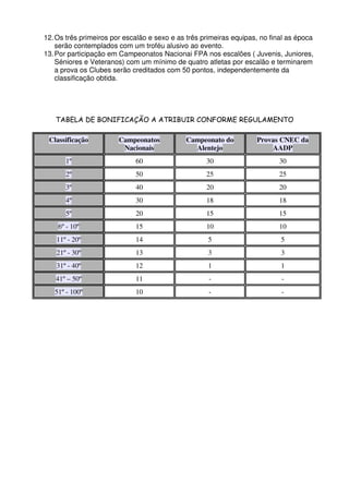 O documento descreve o Circuito Corridas da Associação de Atletismo do Distrito de Portalegre, com o objetivo de promover a prática sustentada de atletismo nas modalidades de corta-mato, estrada e montanha. O circuito atribui pontos aos atletas e clubes pelas suas classificações ao longo do ano, premiando no final os melhores de cada escalão e as melhores equipas.