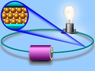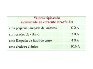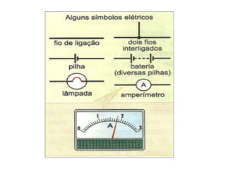 O documento descreve o amperímetro, um instrumento usado para medir a intensidade da corrente elétrica em ampères. Explica que em um circuito simples a corrente tem a mesma intensidade em todas as partes e que a corrente elétrica representa o fluxo de elétrons.