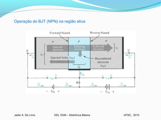 O documento descreve um curso de eletrônica básica que inclui tópicos sobre circuitos básicos com transistores bipolares, operação de transistores NPN e PNP na região ativa, modelos de transistores, determinação de pontos de polarização, amplificadores e seus ganhos.