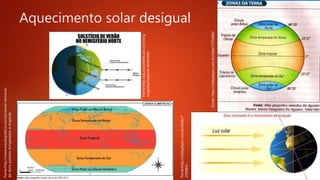O documento discute os principais conceitos da circulação atmosférica, incluindo: (1) o aquecimento desigual da superfície terrestre cria zonas de baixa e alta pressão que influenciam os ventos; (2) as células de circulação geral transportam calor dos trópicos para os pólos; (3) as monções ocorrem quando os ventos mudam de direção entre verão e inverno na Ásia e no norte da Austrália.