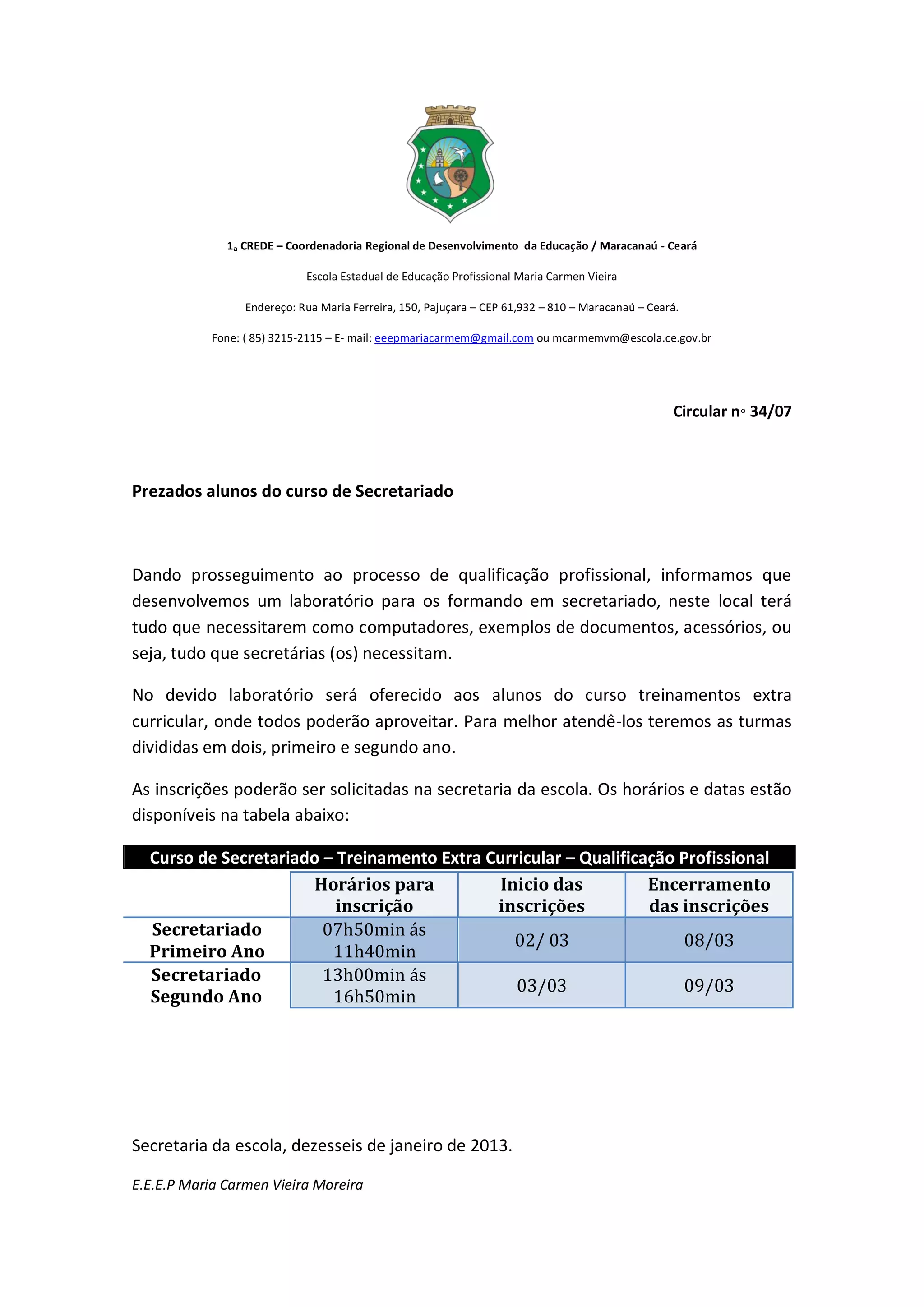 A escola desenvolveu um laboratório para alunos do curso de secretariado com computadores, documentos e acessórios para treinamento. Serão oferecidos treinamentos extracurriculares divididos em turmas de primeiro e segundo ano com horários e datas de inscrição disponíveis.