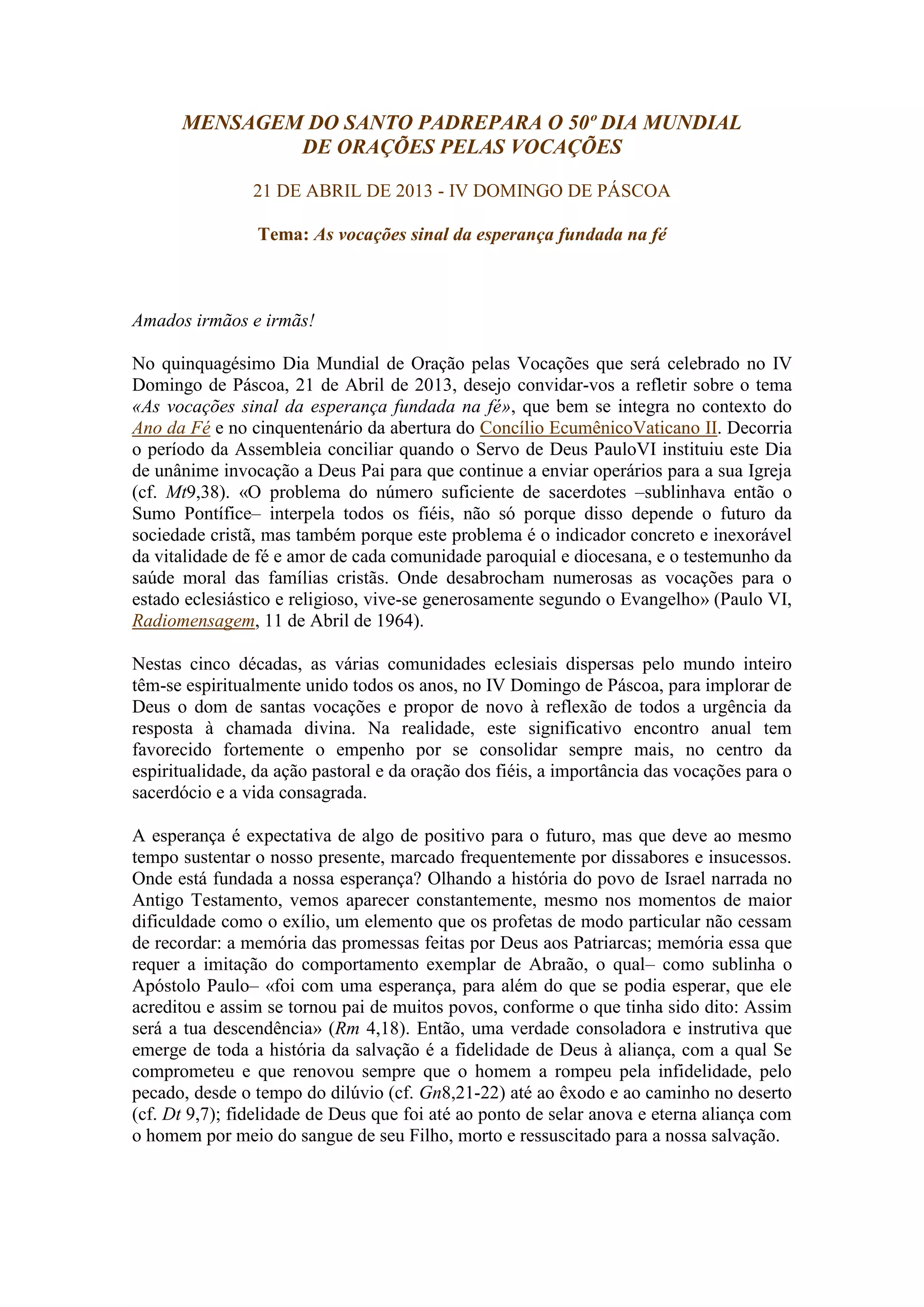 1) O Papa convida a refletir sobre as vocações como sinal de esperança fundada na fé no contexto do Ano da Fé e do 50o Dia Mundial de Oração pelas Vocações.
