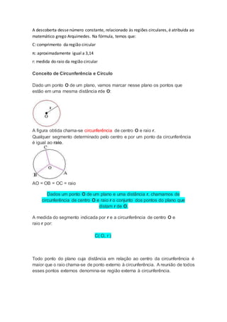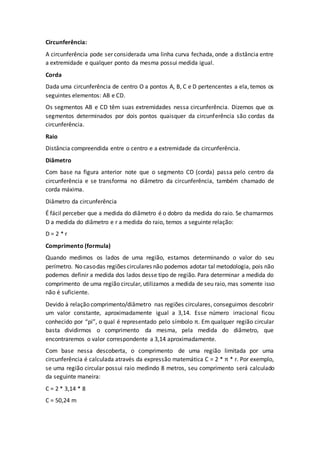 A circunferência é uma linha curva fechada onde a distância entre qualquer ponto e a extremidade é igual. Uma corda conecta dois pontos na circunferência. O raio mede a distância do centro ao ponto da circunferência, enquanto o diâmetro passa pelo centro e mede o dobro do raio. O comprimento da circunferência é calculado pela fórmula C=2πr, onde r é o raio e π é aproximadamente 3,14.