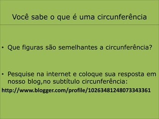 O documento descreve uma atividade sobre circunferências onde os alunos medem o comprimento e diâmetro de círculos feitos de EVA para verificar a relação entre o comprimento da circunferência e o raio. Também discute definições básicas de circunferência como raio, arco e corda, e explica porque a circunferência tem 360 graus.
