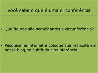 Você sabe o que é uma circunferênciaQue figuras são semelhantes a circunferência?Pesquise na internet e coloque sua resposta em nosso blog,no subtítulo circunferência.
