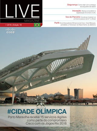 Segurança: Como lidarcom a ameaça de sequestro de dados Inovação: Aliança vai acelerar a digitalização do ensino na AL Voz do Parceiro: Iniciativas mostram os primeiros passos de IoT no Brasil Perfil: Os embaixadores Olímpicos da Cisco: Yane Marques, pentatleta; e Yohansson do Nascimento, do atletismo> 1º semestre 2013 | edição 10 LIDERANÇA Rodrigo Dienstmann assumepresidência daCiscodoBrasil VOZ DO CLIENTE NETexpandeserviço NOWeinstala hotspotsemruasde grandecirculação INOVAÇÃO Novas tecnologias revolucionam sala de aula ; Colégio Porto Seguro adere ao WiFi Bancos adotam ferramentas de colaboração e personalizam atendimento futurofuturofuturofuturofuturo dododo Aagência > 2016 | Edição 19 #CIDADE OLÍMPICA Porto Maravilha recebe 15 serviços digitais como parte do compromisso Cisco com os Jogos Rio 2016