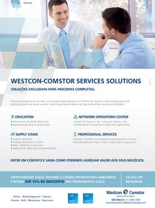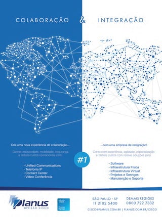 SÃO PAULO (11)5186-4343 RIO DE JANEIRO (21) 3590-6201 www.comstor.com.br querocisco.br@comstor.com O sucesso de hoje depende de muitas pessoas, em muitos lugares diferentes. E as soluções de Colaboração e Comunicações Unificadas da Cisco aproximam os negócios, transformando radicalmente a experiência das empresas. CONFERÊNCIAS COMUNICAÇÕES UNIFICADAS E COLABORAÇÃO ENDPOINTS Torne as empresas mais colaborativas com as soluções de telefonia e videoconferência da Cisco. Trabalho contínuo em várias plataformas e dispositivos Mensagens instantâneas Compartilhamento de tela Conferências por web e vídeo Ambientes de trabalho compartilhados Maior envolvimento entre os colaboradores Redução de custos com deslocamento • • • • • • • BENEFÍCIOS QUE IMPULSIONAM A PRODUTIVIDADE: