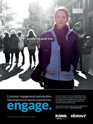 11 “Todos acham queestamos em meio a uma revolução digi- tal, quando na verdade estamos vivendo uma transformação sem precedentes”. Esta foi uma entre as várias afirmações proferidas pelo presidente do Grupo Abril, Walter Longo, ao público formado por clientes e parceiros da Cisco, reunidos no evento “Cisco Digital Transformation Meeting, em junho, no Guarujá, litoral de São Paulo”. Durante o evento, que contou com palestras de economistas, Macrotendências da fase pós digital Cisco reúne clientes e parceiros para debater a transformação digital dos negócios jornalistas, cientistas políticos e executivos de diferentes setores, Longo listou quatro macrotendên- cias a serem observadas pelos to- madores de decisão, não apenas para colocar os negócios nos tri- lhos digitais, como para torná-los vanguardistas. São elas: 1Efemeridade – A aceleração da realidade está afetando o com- portamento das novas gerações e as empresas terão que atuar de maneira efêmera para se manterem perenes. 2Mutualidade – A internet das coisas é a maior mudança de todas, porque as máquinas vão falar entre si. 3Sincronicidade – Os antigos bancos de dados transformaram –se em banco de fatos. 4Tensionalidade – No mundo atual o maior risco das marcas é passar desapercebidas. “Tensão é o que torna pessoas, histórias e marcas mais interessantes e surpre- endentes”, finalizou.