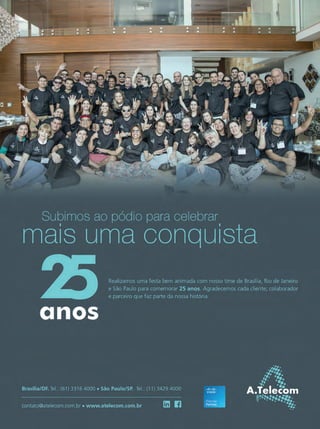 VOZ DO CLIENTE 56 PonteRio-Niterói disponibiliza Wi-Fi para usuários em toda a sua extensão A Ponte Rio-Niterói, ad- ministrada pela conces- sionária EcoPonte, do grupo EcoRodovias, pas- sou a oferecer, em junho, conexão Wi-Fi gratuita em todo o trecho de 13,2 km. A iniciativa, instalada e administrada pela Linktel, contou com os serviços de integração da 3S Networks e a participação da Cisco como fornecedora dos equipamentos. Conforme explica Leonardo Moura, coordenador de Infraes- trutura do Grupo EcoRodovias, a oferta é um dos compromissos previstos no contrato de concessão da Ponte. “Prevemos a entrega de 512 KB de velocidade de conexão para cada usuário”, diz. Segundo ele, o desafio do projeto foi manter a conexão estável para o usuário em movimento. Algo re- solvido com a tecnologia presente na controladora e nos access points (APs), da Cisco. Wagner V. Pretel, coordenador de projeto da Linktel, informa Conexão de ponta a ponta REPETIDORAS GARANTEM CONECTIVIDADE CONTÍNUA AO LONGO DOS 13,2 KM DA PONTE RIO-NITERÓI vel, do comercial ao engenheiro de campo, e concluímos o projeto com sucesso e dentro do prazo”, completa. Experiência do usuário Outro gargalo, agora técnico era a estrutura dos próprios veículos, que pode degradar em até 15dB da potência do sinal Wi-Fi. “O pro- jeto contou com equipamentos que superam este desafio”, diz o executivo da Linktel. “Baseado na velocidade máxima permitida na via (80 km/h), acreditamos que a experiência do usuário será boa. Exceção feita a veículos blindados, cujo isolamento da estrutura é ainda maior”, confirma. Moura, da EcoRodovias, afirma que o projeto da Linktel foi com- pleto, já prevendo os locais onde há mais concentração de pessoas para instalar mais equipamentos, como na praça de pedágio ou nos pontos de ônibus na entrada da Ilha do Mocanguê. que, junto com a configuração da controladora, para assegurar qualidade de serviço, estão sendo instaladas 60 repetidoras de sinal wireless ao longo da ponte. “Os equipamentos da Cisco já possuem configurações que forçam a tran- sição do dispositivo móvel para a repetidora mais próxima, com sinal melhor”, explica. A 3S Networks foi a responsável pelo gerenciamento do projeto e o fornecimento de equipamentos e suporte técnico contínuo, entre- gando um serviço especializado de alta qualidade , diferencial que fez com que o projeto se concretizasse dentro do prazo de dez dias. “O desafio era enorme, pois tí- nhamos um prazo muito agressivo para finalizar o projeto, mas ainda tínhamos que incluir no cronograma a entrega dos equipamentos e casar com as agendas dos engenheiros da 3S”, comenta Jonas Viana, gerente comercial da integradora. “Toda a equipe atuou de forma impecá- DIVULGAÇÃO/ECOPONTE