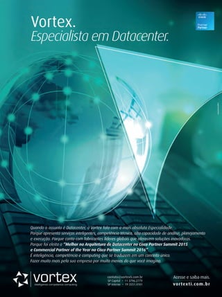 parceira em trabalhoscom a Uni- med VTRP desde 2011, entram na história. O escopo do projeto previa a criação de dois data centers, um principal na nova sede e um backup, localizado no antigo prédio, man- tido para atendimento ao público e comercialização de planos. Além de servidores, storages, no- vos equipamentos de rede e, prin- cipalmente, soluções de segurança seriam adquiridos para compor o novo ambiente, agora alinhado com as demandas de negócios da Unimed VTRP e as principais tendências de mercado, inclusive sob o ponto de vista de segurança. Fuchs explica que o primeiro ponto foi estudar como seria a interligação entre os novos data centers e a infraestrutura de rede da nova sede. De acordo com ele, o antigo centro de dados contava com equipamentos de rede e de borda da chamada linha de entra- da, que já precisavam ser trocados, algo que já havia ocorrido com os dispositivos do core de rede. Ainda na fase de estruturação do projeto, Fuchs diz que a inten- ção era ter uma visão geral da rede como um todo, exigindo também que ela fosse fácil de ser operada. “Para o novo prédio, iríamos con- tar com sistemas de telefonia e de videomonitoramento (CFTV) total- mente IP, somando 2,5 mil pontos de conexão. Era fundamental que pudéssemos garantir conexão, ve- locidade e segurança desses pontos como um todo”, explica. Controle da rede Por isso, o diretor comercial da InfraTI, Augusto Bueno, lembra a importância dos softwares ad- quiridos, sendo o ISE essencial para consolidar todos os acessos e equipamentos de rede. “A solução seria a chave para integrar todo o projeto”, diz. Nathalia Gomes, gerente de con- tas da Cisco, explica que “o ISE integra toda a parte de autenticação de políticas de segurança da em- presa, independente da rede que o usuário esteja utilizando, seja Wi-Fi, cabeada ou VPN”. Basicamente, a ferramenta é uma grande central de inteligência, funcionando como uma máquina de reconhecimento dos usuários e equipamentos que trabalham dentro da rede. “Se algum componente for co- nectado à rede, o ISE o identifica e configura nas políticas de segurança automaticamente”, complementa Bueno, acrescentando que a solução permite a qualquer analista de TI conectar uma câmera ou telefone IP, ou mesmo um PC de usuário, com facilidade e configurando o equipamento automaticamente. O diretor da integradora comenta que o projeto também envolveu a implantação de firewall ASA Fi- repower que, diferente das solu- ções tradicionais, está conectado à central dos usuários, identificando cada acesso e o que fazem na rede. “Dessa forma, a Unimed VTRP tem todo o controle do conteúdo aces- sado, levando a segurança até um nível mais elevado da conexão”, diz. Em outras palavras, o ASA Fi- repower complementa o trabalho do ISE. “Enquanto o último faz a parte de políticas de segurança, o primeiro atua para garantir que o usuário esteja cumprindo as regras”, explica Nathalia, da Cisco. Por fim, o Prime sela o paco- te de soluções, dando ao NOC (Network Operations Center) da Unimed VTRP as informações so- bre a saúde dos componentes das redes Wi-Fi e cabeada. Segundo Bueno, as plantas da nova sede fo- ram inseridas dentro da plataforma, sendo possível, inclusive, conhecer o status da rede Wi-Fi no quesito de interferência e velocidade de forma gráfica e em tempo real. “Hoje, se um computador for conectado à rede sem liberação de acesso, ele ficará numa cone- xão separada. Esse era um nível de segurança que já buscávamos faz tempo”, comenta Fuchs. EMPRESA APROVEITOU PROJETO DE NOVO PRÉDIO PARA MODERNIZAR AMBIENTE DE REDE 53