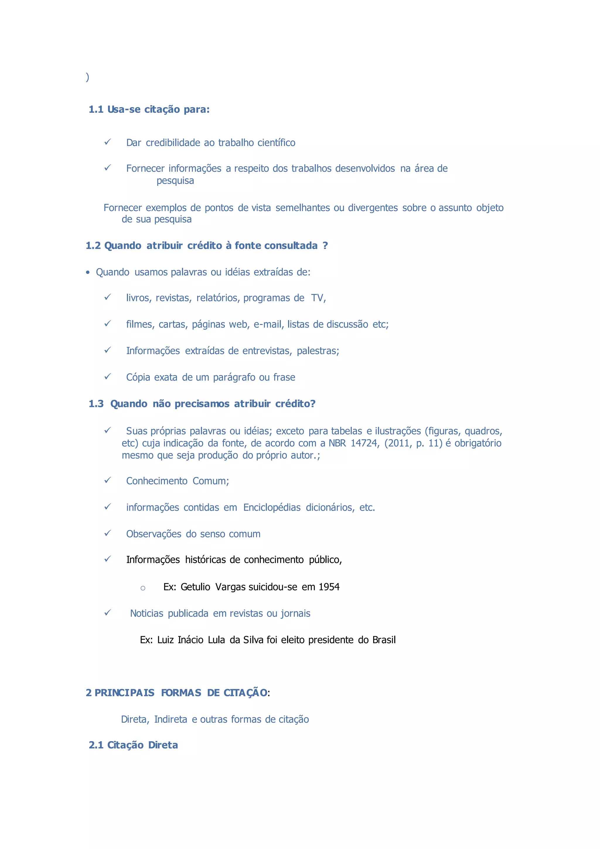 O documento discute as diretrizes para citações em trabalhos acadêmicos, incluindo: 1) Quando usar citações para dar credibilidade e fornecer informações sobre pesquisas relacionadas; 2) Como atribuir crédito a fontes consultadas; 3) Quando não é necessário atribuir crédito; 4) As principais formas de citação direta, indireta e outras variações.