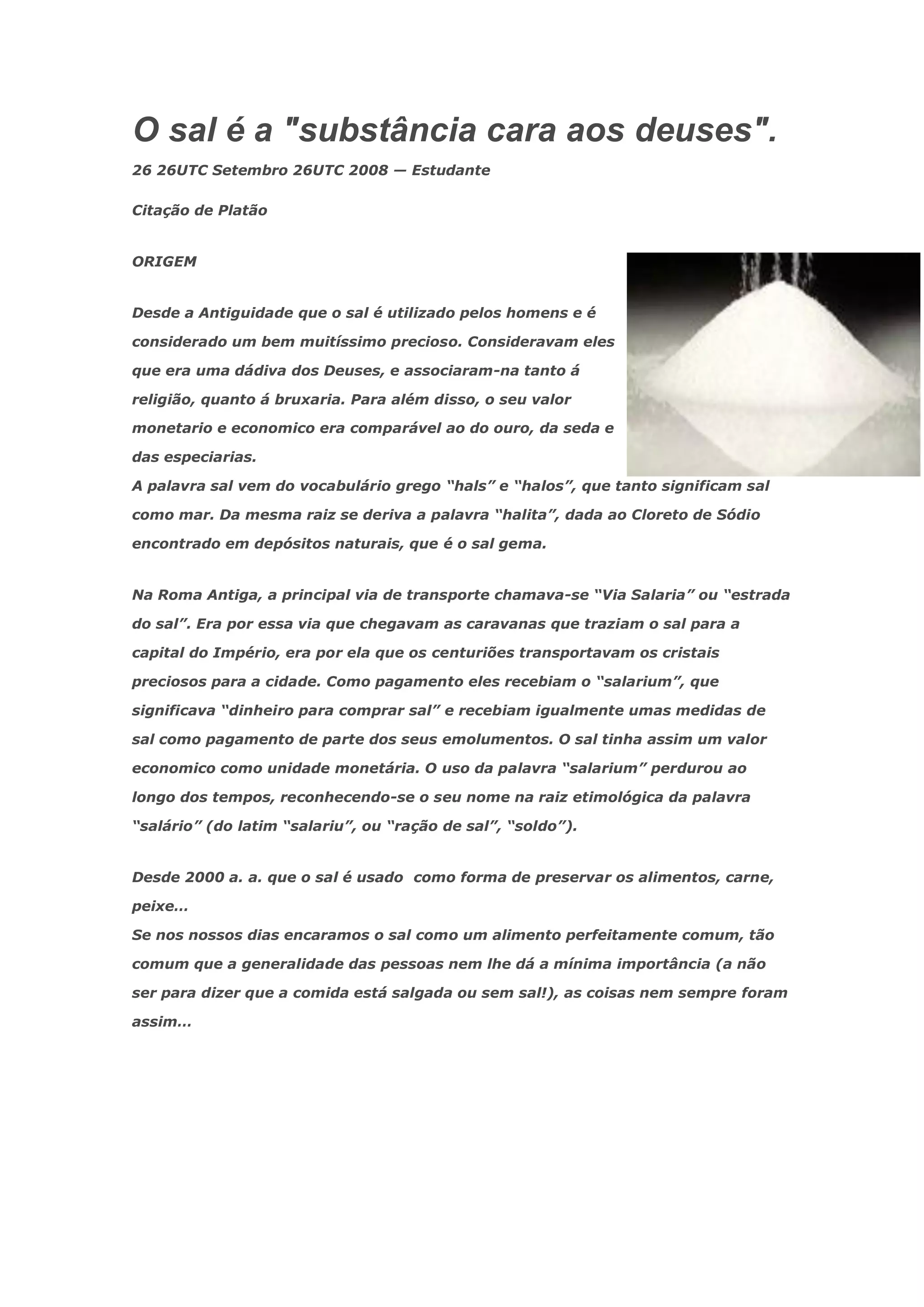 O documento descreve a história e significado simbólico do sal ao longo dos tempos e em diferentes culturas. O sal era considerado um bem precioso e sagrado pelos antigos, sendo usado em rituais religiosos e como forma de preservação de alimentos. Sua importância se estendeu ao valor econômico e aos símbolos de sabedoria, pureza e fidelidade na Bíblia.