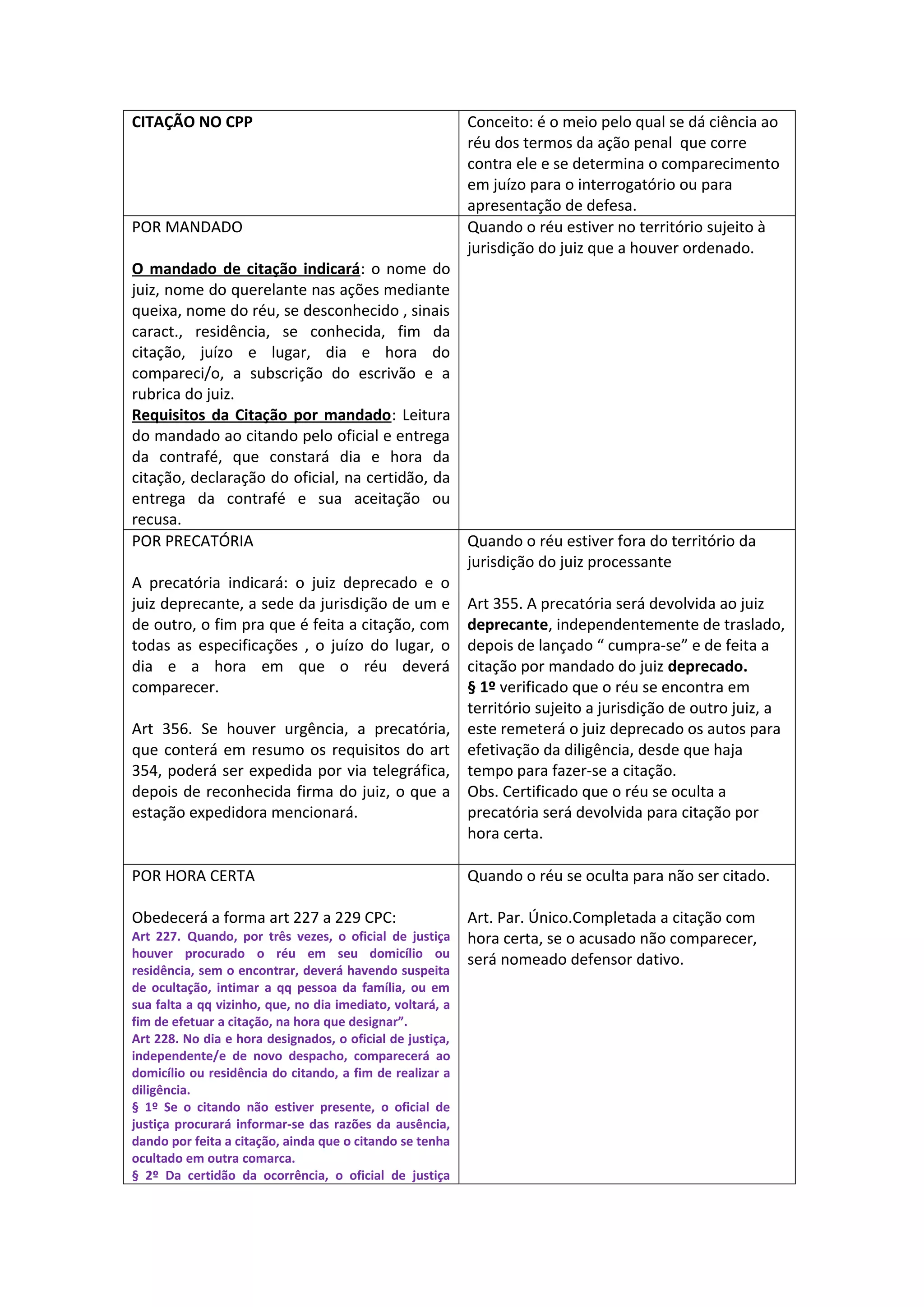 1) O documento descreve os diferentes métodos de citação do réu no processo penal brasileiro, incluindo por mandado, precatória, hora certa, edital, requisição, carta rogatória e para réus presos ou funcionários públicos.