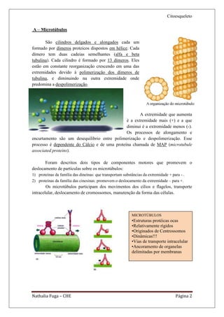 O documento descreve os principais elementos do citoesqueleto (microtúbulos, microfilamentos e filamentos intermediários) e suas funções na manutenção da forma celular e nos movimentos celulares, como transporte intracelular, divisão celular e contração muscular.