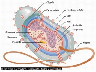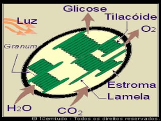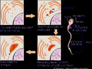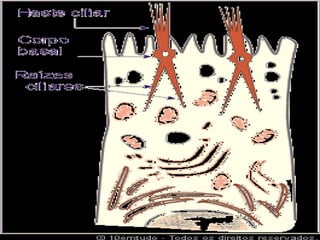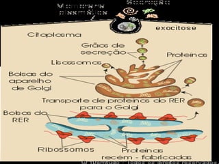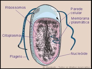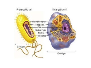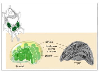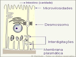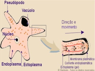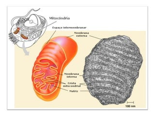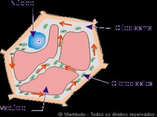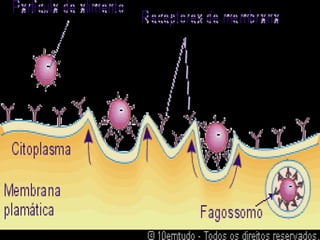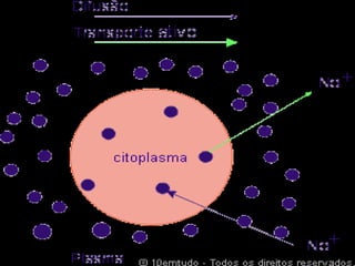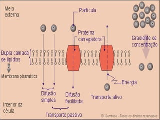 O documento descreve as características das células eucariotas e procariotas, incluindo a membrana plasmática, o citoplasma e as organelas. Detalha os tipos de transporte através da membrana plasmática, como a difusão, osmose e transporte ativo, e processos como a fagocitose e a pinocitose.