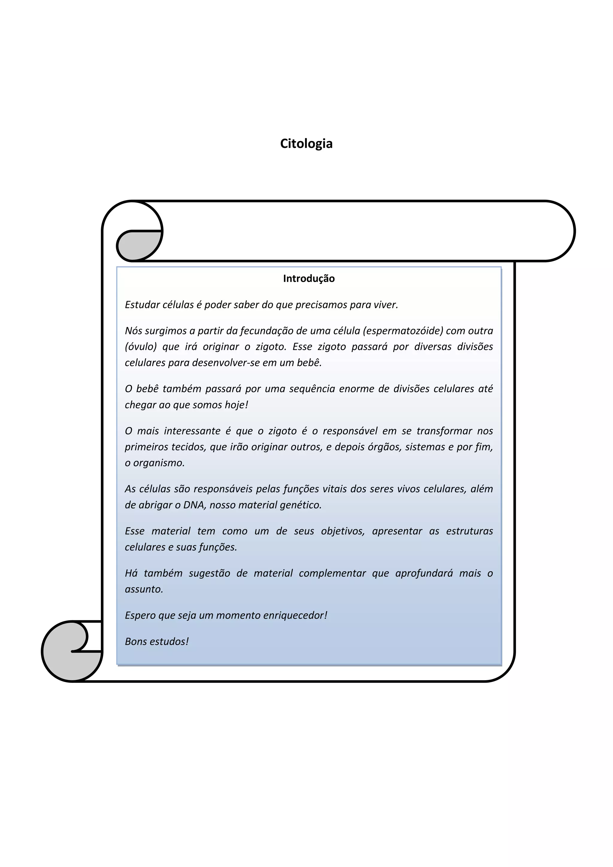 A citologia estuda as células e suas estruturas. As células animais e vegetais possuem membrana plasmática, núcleo e citoplasma. As células bacteriana e vegetal possuem parede celular. As bactérias são procariotas e as células animais e vegetais são eucariotas.
