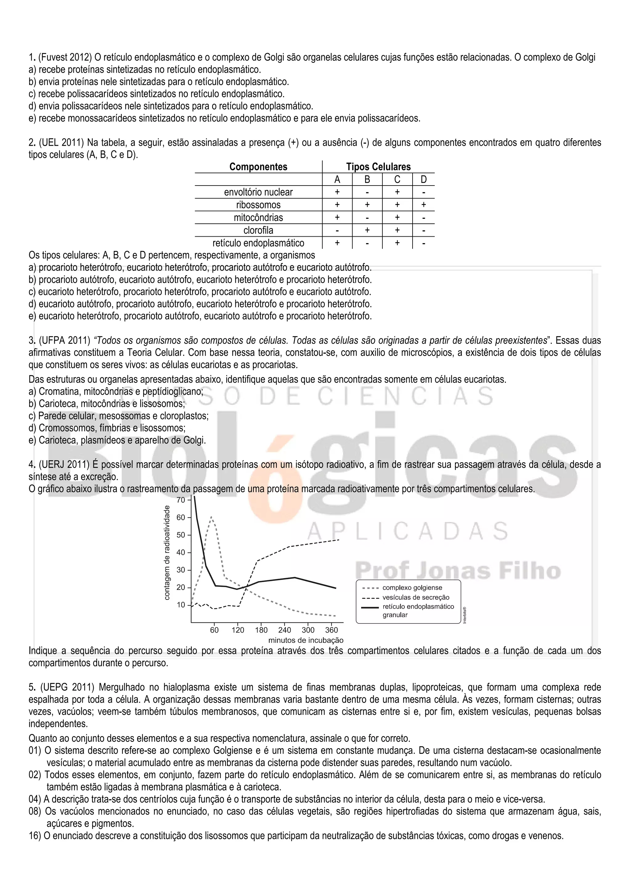 1. (Fuvest 2012)O retículo endoplasmático e o complexo de Golgi são organelas celulares cujas funções estão relacionadas. O complexo de Golgi
