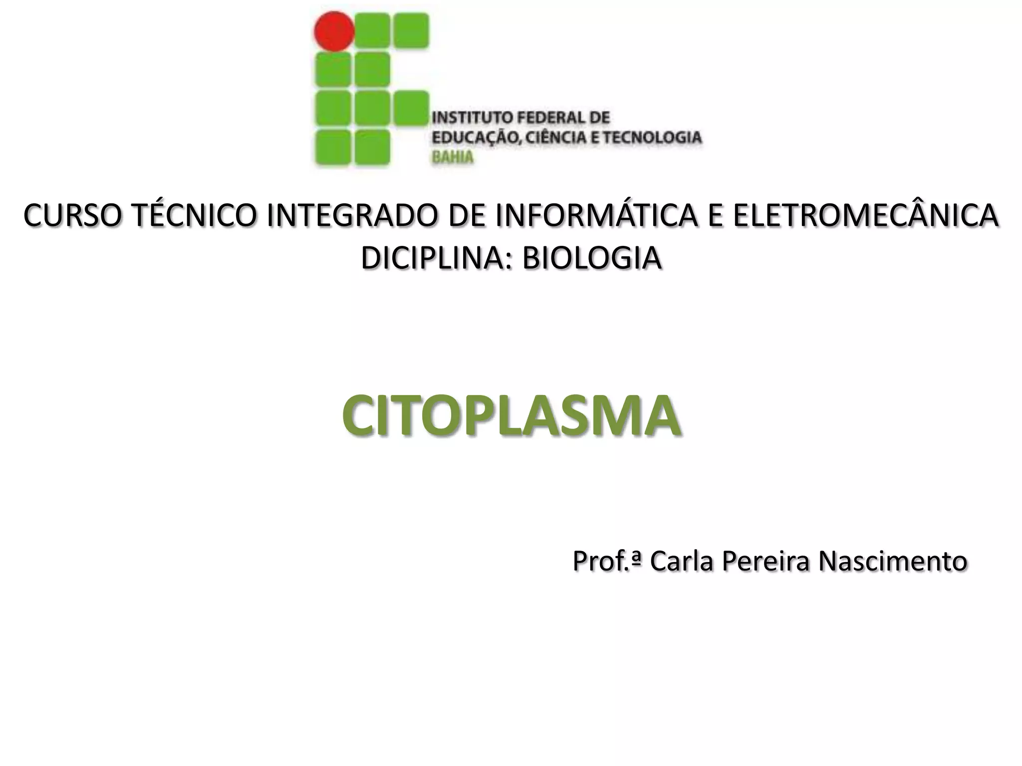 O documento descreve as principais estruturas do citoplasma celular, incluindo: 1) Retículo endoplasmático rugoso e liso, complexo de Golgi, lisossomos e peroxissomos que produzem e modificam proteínas e lipídios; 2) Mitocôndrias, cloroplastos e vacúolos que realizam processos como respiração e armazenamento; 3) Citoesqueleto formado por microtúbulos, centríolos e microfilamentos que dão forma à célula.