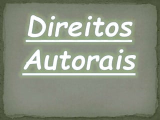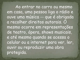 O documento discute a lei de direitos autorais no Brasil, que protege obras desde sua criação e regula a cobrança de direitos autorais pela reprodução ou exibição de obras, mesmo em meios digitais. Há um movimento para modernizar a lei e adaptá-la ao mundo digital.