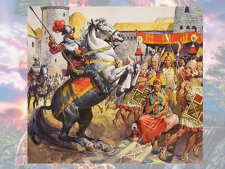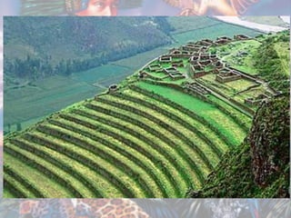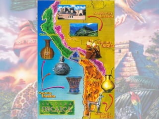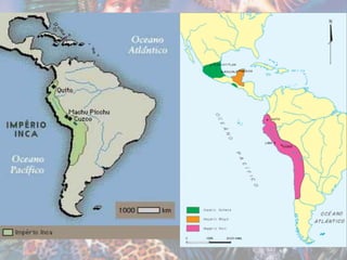 O povo Inca originou-se na região entre o Lago Titicaca e Cuzco no Peru entre 1200-1533 d.C., formado por diversos povos ao longo dos séculos. Tinham uma sociedade hierarquizada dividida em nobres, trabalhadores e escravos. Seu vasto império chegou a 15 milhões de pessoas, mas entrou em declínio devido às disputas internas de sucessão até ser conquistado pelos espanhóis liderados por Francisco Pizarro em 1528.
