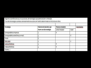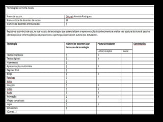 O documento descreve as tecnologias disponíveis em uma escola e como elas são usadas. A escola tem 1 kit multimídia, 17 computadores com internet, 1 projetor e outros equipamentos. As tecnologias mais usadas são computadores, câmeras digitais e pen drives para pesquisas e projetos de alunos. Contudo, as tecnologias ainda são usadas principalmente para transmissão de informações em vez de construção do conhecimento.