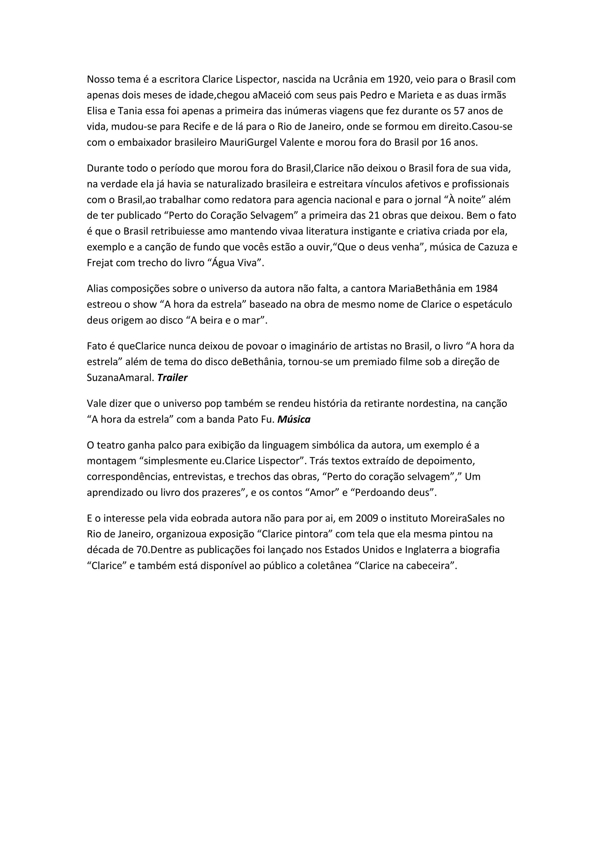 Clarice Lispector nasceu na Ucrânia em 1920 e veio para o Brasil com apenas 2 meses de idade. Ela se mudou para diversas cidades brasileiras e formou-se em direito no Rio de Janeiro. Morou fora do Brasil por 16 anos, mas manteve vínculos com o país por meio de sua literatura e trabalho jornalístico. Sua obra influenciou muitos artistas brasileiros e continua sendo estudada e celebrada até hoje.