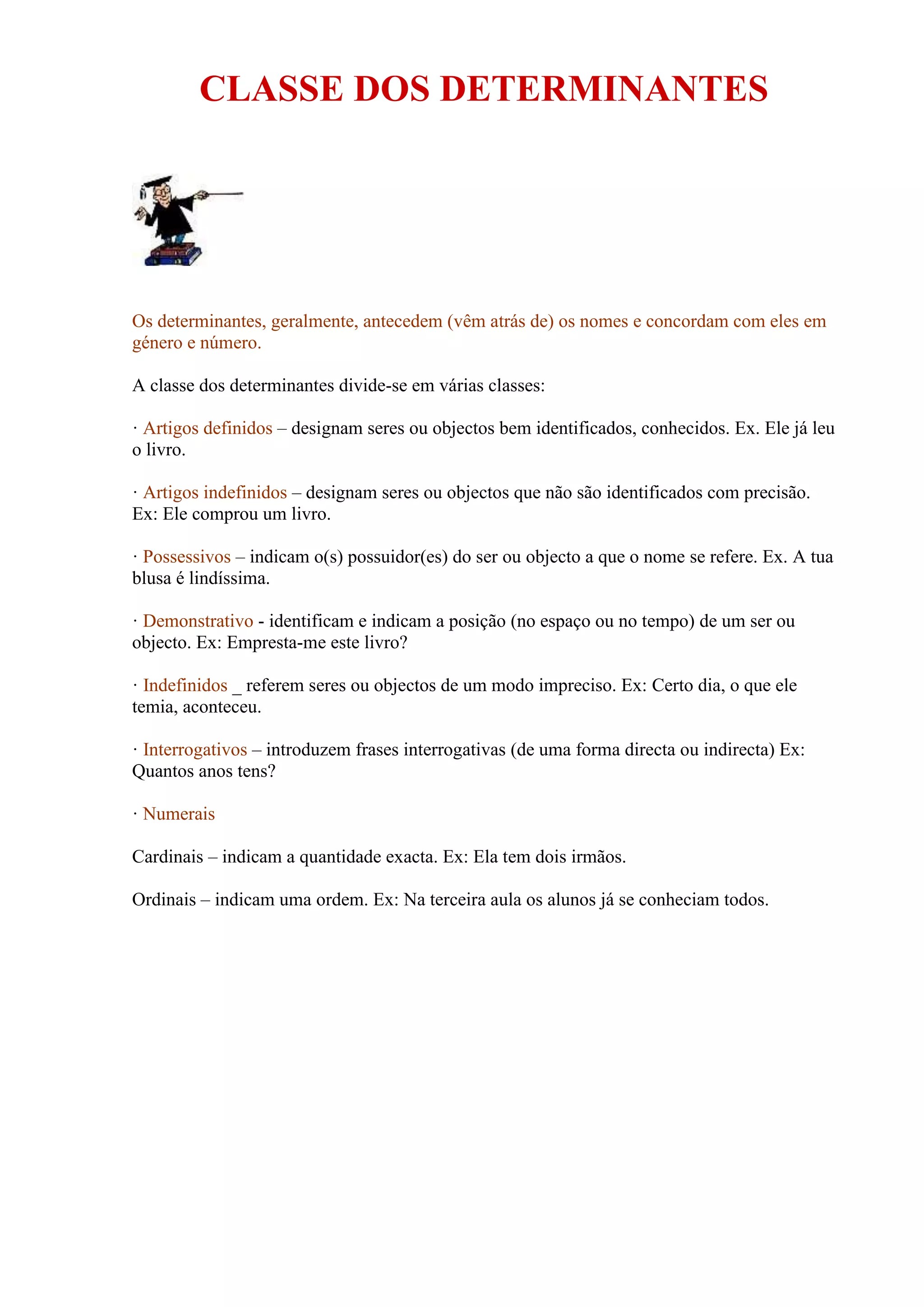 O documento descreve as principais classes de determinantes em três frases: