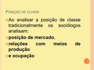 O documento discute como sociólogos como Bourdieu analisam a posição de classe levando em conta fatores culturais como estilo de vida e padrões de consumo, não apenas aspectos econômicos. Segundo Bourdieu, as divisões de classe estão associadas a distintos gostos culturais e estilos de vida. O documento também apresenta exemplos de como esses conceitos aparecem na novela brasileira "Senhora do Destino".