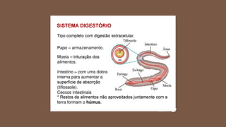 O documento descreve as características de duas classes de anelídeos, Oligocheata e Polychaeta. As minhocas da classe Oligocheata têm corpos alongados cobertos por muco e usam pequenas cerdas para locomoção. Os poliquetas da classe Polychaeta vivem principalmente no mar e variam em tamanho, com muitas cerdas e parapódios importantes para identificação e locomoção.