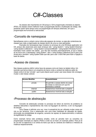 O documento discute classes em C#, incluindo: (1) classes são importantes para programação orientada a objetos; (2) namespaces organizam classes em aplicações; (3) modificadores de acesso controlam visibilidade de membros de classe.