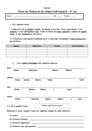 Este documento fornece uma lição de língua portuguesa para alunos do 5o ano. Contém exercícios de análise morfológica de palavras, identificação de classes gramaticais, conjugação verbal em diferentes tempos e modos, e preenchimento de tabelas sobre poesia.